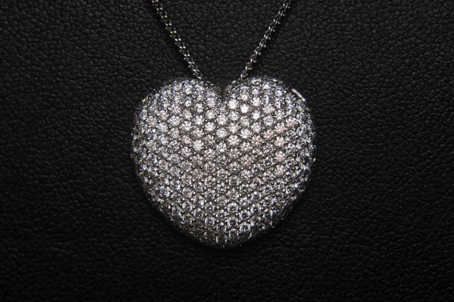 Details: 9ct white gold hand-made heart-shaped pendant, claw set with over 150 1pt diamonds.