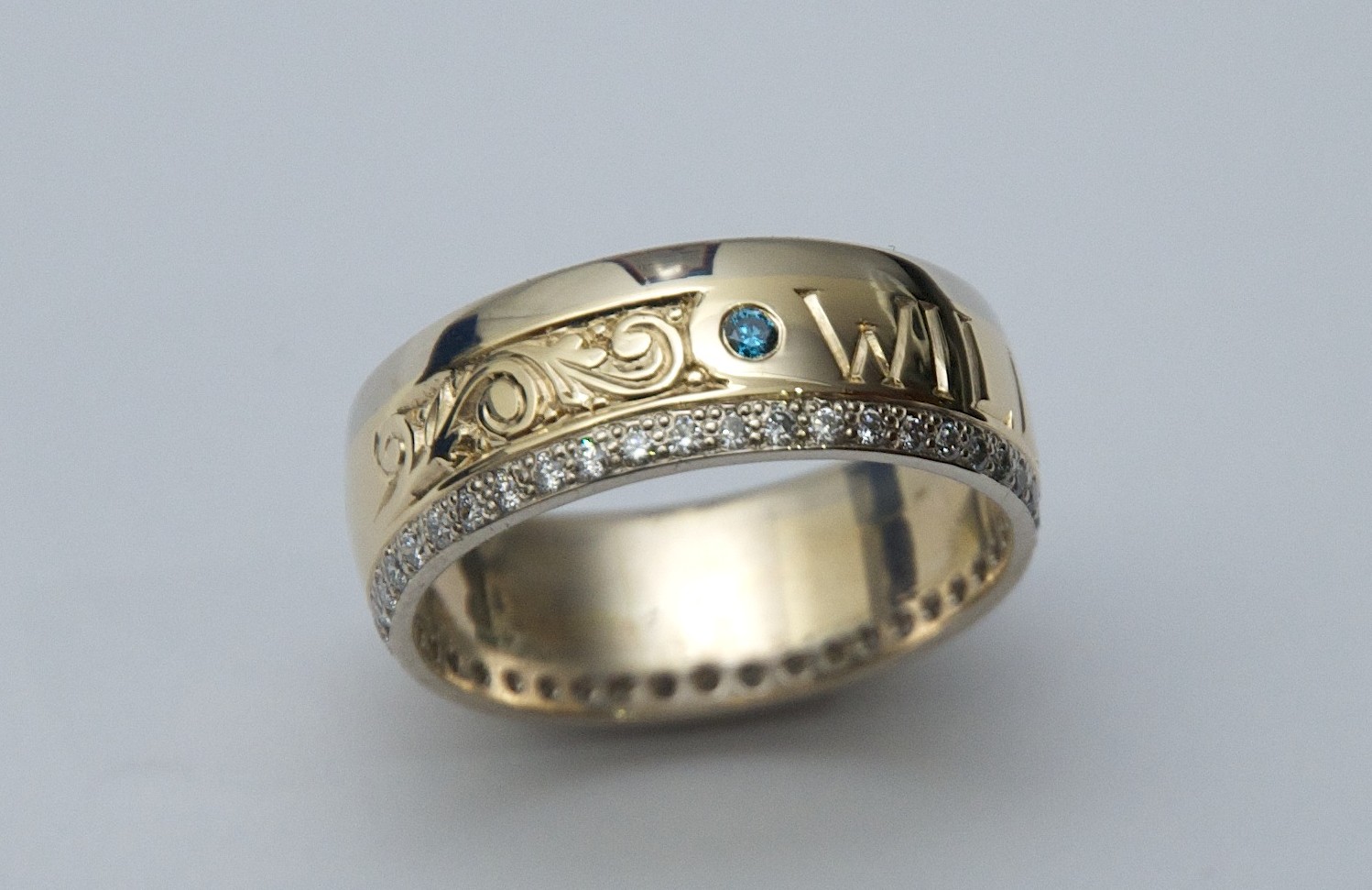 Details: 9ct yellow and white gold hand-made 7mm wide wedding ring, 1pt bead set white diamonds, 5pt pressure set treated blue diamond, hand carved name and scroll work.