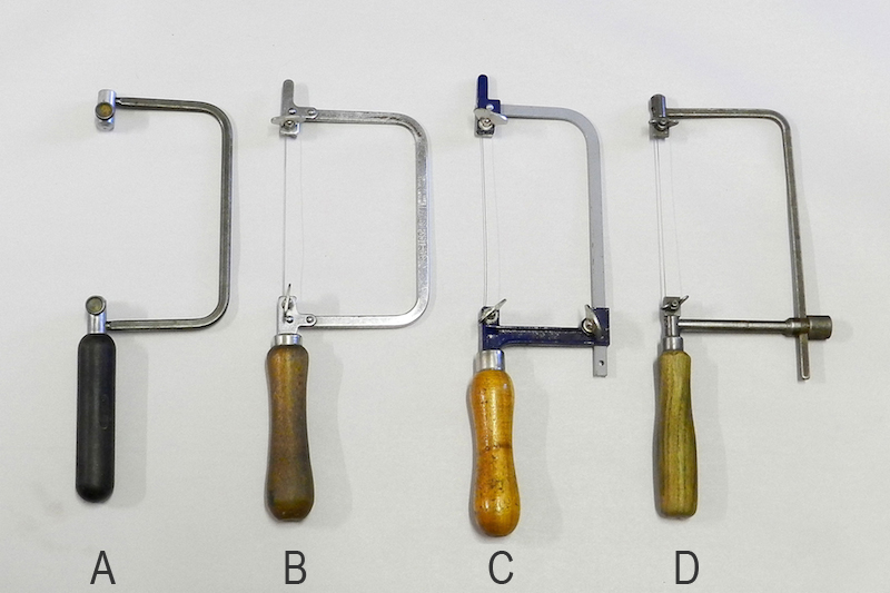 This image (Fig.1) shows a collection of standard jewellers saw frames, often called piercing saws. There are basically two types of saw frame, rigid (A and B) and adjustable (C and D). Model A is a “Swiss Rigid” (also available as adjustable), model B an “English Rigid” and model C is a “German Adjustable”. There are many variations of both rigid and adjustable frames, some of them being ridiculously expensive, others needlessly fancy. The centre two frames can be purchased for less than $10 each and they are the ones I would buy, they are the ones I use. If you are going to purchase just one, get an adjustable frame with an 85-95mm throat. It is the most versatile, they are cheap and spare knobs are readily available. They will last a lifetime. Frame B is over 25 years old while frame D is over 40. Both are used nearly every day.