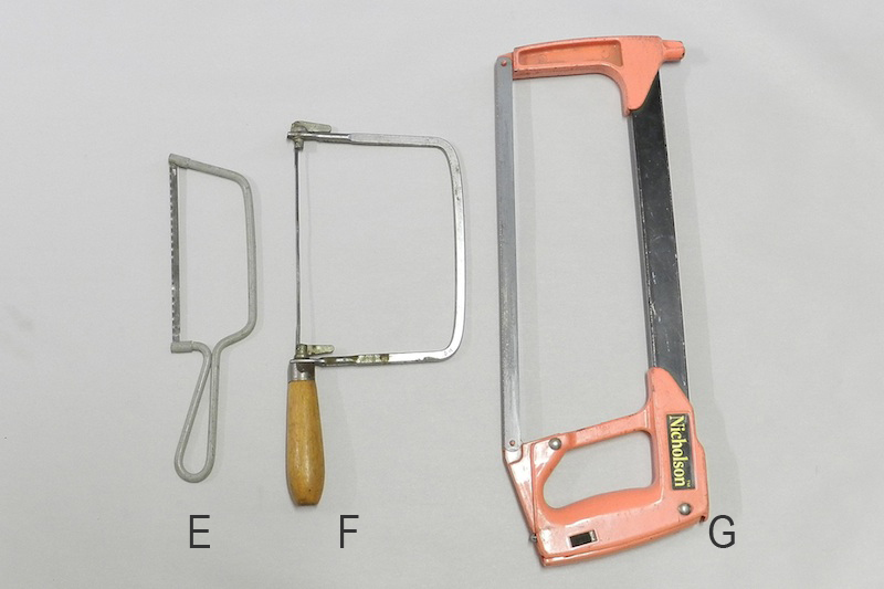 Now, the metalworkers saws. All these saws are readily sourced from a hardware store. Model F is a coping saw, used more for woodwork than metalwork but blades are made for use with metal. The blade is rotatable and as such, the back of the frame may be perpendicular to the cutting line rather than behind and following it. Any angle in between is possible as well. The coping saw will also allow you to follow shallow curves. While similar in appearance to the jewellers saws above, it is not a replacement and lacks the ability to follow tight curves. The hacksaw, model G, lives up to its name. Designed for grunt work as it were. For thick rod, bars, sheet, if you have to go at it hard, it’s the one to go for.